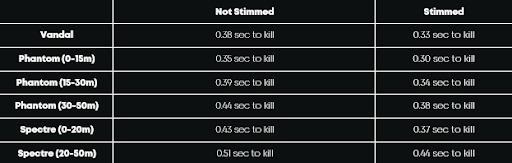 Now, what does an increased ROF represent? Basically, when you think of a bigger fire rate you are looking at a bigger potential damage output, which can be translated as a lower time needed to get a kill or destroy an object, like Sage’s wall and Killjoy’s turret. Thus, an increase in the ROF can be read as a decrease in the time needed to kill something. In the table chart below, you can see the effects of a 15% increase in ROF, the same buff provided by the Stim Beacon, in three of the most used weapons in the game (namely the Vandal, Phantom, and Specter) while considering only body shots and no misses in a full health target: