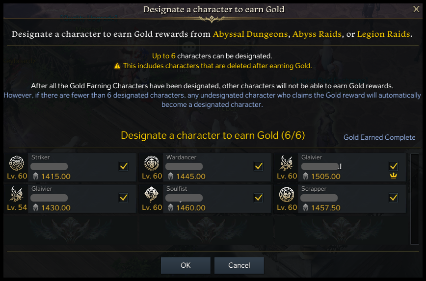 The main consistent source of gold is through weekly activities such as Abyssal Dungeons, Abyss Raids, and Legion Raids. Each week only six characters in a player’s roster may obtain gold as a reward from doing the aforementioned activities. Usually, players will designate their six highest ilvl characters as gold earners due to having access to higher level content. Characters also have a limit of three Legion Raids per week that they can obtain gold from. This is currently not a factor for global servers as only three Legion Raids have been released. However, keep this in mind for future raid releases.