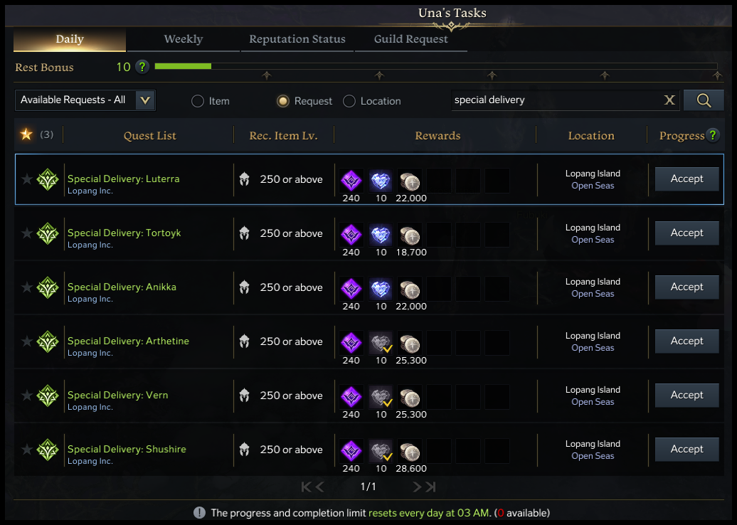 Another consistent way to generate silver is through what are known as ‘Lopang dailies’. Lopang dailies include six different Una’s Tasks, called ‘Special Delivery’, that provide silver as a reward. The amount of silver varies depending on the ilvl of the characters. Tier 3 characters generate an average of 25,000 silver per Lopang daily. These Una’s Tasks take considerably low effort, especially when players set up Bifrosts for each ‘Special Delivery’ location. Many players have huge rosters just to set up as many ‘Lopang Alts’ as possible, which generates a constant source of silver. Various Weekly Una’s Tasks also provide silver rewards.