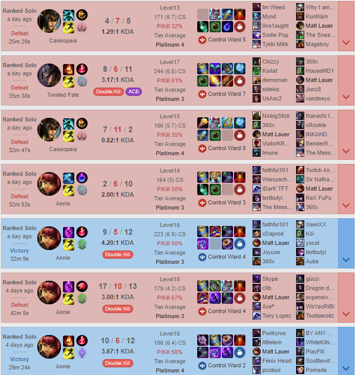This is extremely important because the mechanical aspect of the game is much easier to pick up for that champion because you haven't gone a long enough time not playing the champion to feel rusty. The added benefit to that, is that in feeling more in tune with your champions capabilities, less attention is needed on that aspect of the game, and thus more attention can be applied elsewhere. Second, you can easily learn your matchups. If you play over 20 different champions but play against the same 5 champions every game, that’s 100 matchups you need to learn.