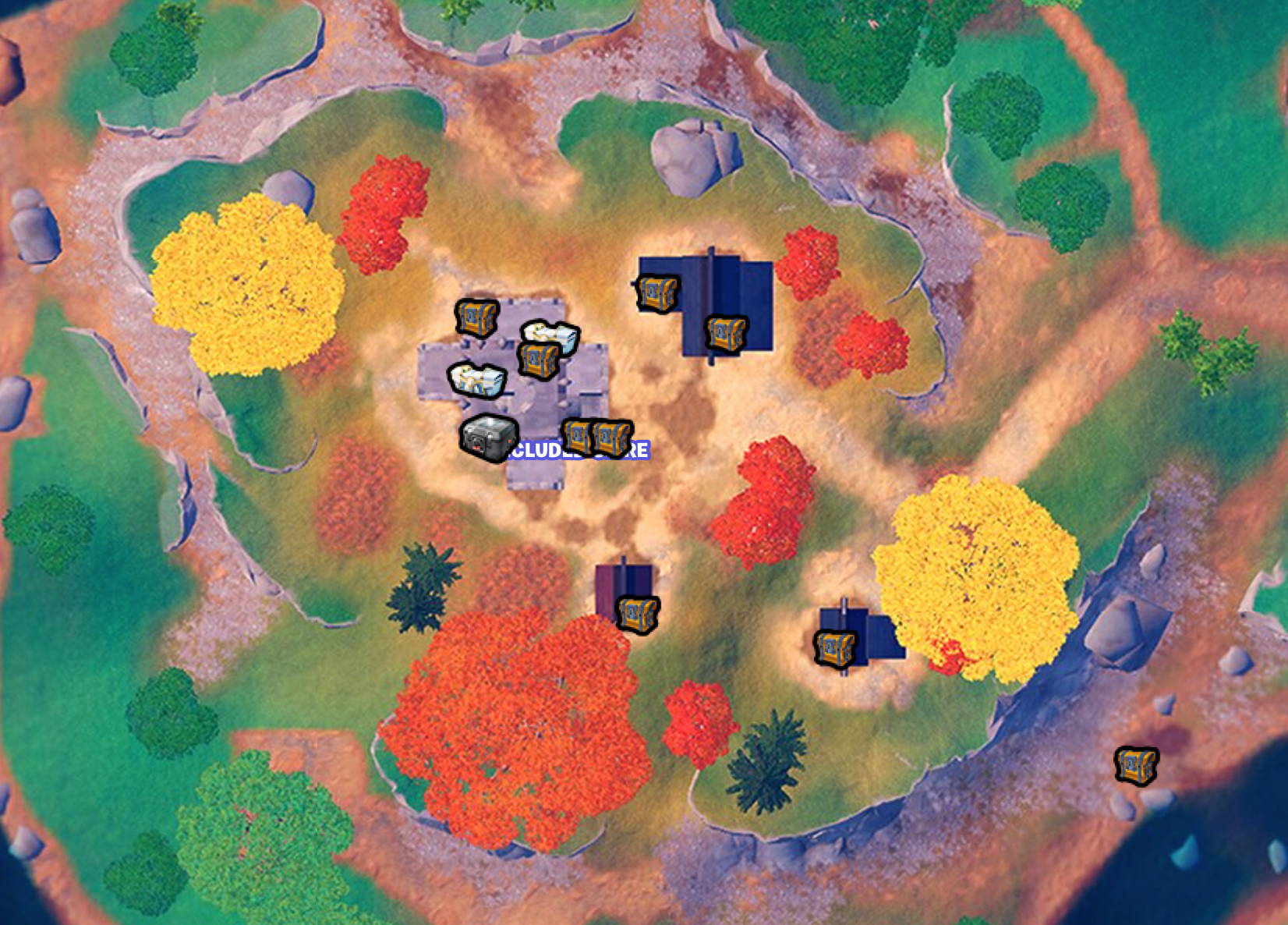This one is more for the solo players out there. You won’t find many people here but, if someone is landing with you, try landing on the very top to get a head start on some ground loot or weapons. What makes this spot so good are the Holo Chests and having 2 Oathbound Chests spawns. Along with that are a couple of regular chests and some buildings close by if you need some more loot. The Oathbound Chests are the key to this location, as they drop Gold Bars and rare weapons such as the new Shockwave Hammer and Ex-Caliber Rifle. Before you leave, stock up on brick by breaking down the walls.