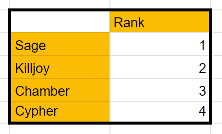 The Sentinel class is probably the hardest to gauge with the current set of statistics. It’s really difficult to analyze the ability to lock down areas simply based on abilities. There is no metric that can properly reflect the impact a Sage Barrier Orb can have. The current system in place does not record things such as damage blocked or enemies blocked. In a similar vein, one cannot gauge the impact of a Trademark or a Cyber Cage, simply because the effects these abilities have are not recorded by Riot’s API. However as time has gone on, Sentinels have started to focus more on their ability to produce consistent damage. And so will be using the same metrics as Controllers, but we will not subtract ADR. That’s result in the following: