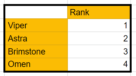 Like with Overall, these ranks should not be super surprising. Jett is, single-handedly, one of the most picked agents, regardless of the map. Even when she is not optimal, many teams try to push her into a slot. Raze and Reyna are map dependent but are also common sights in ranked games and in VCT. The last three are more niche picks, with Yoru’s rework not yet being captured by stats, and Phoenix mainly appearing in ranked.