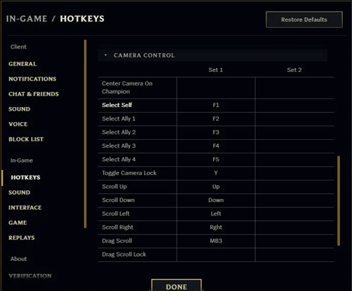 The standard camera controls that you should use are locking/unlocking your camera, and recentering your camera on your Champion. Another important feature of using the camera is to re-center your camera around each of your teammates. This can be done with the ‘F’ function keys.
