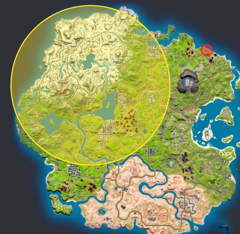 Assume that we have landed at the red circle marked on the map above, and the first zone reveals itself as the area marked in the yellow circle. To perform a deadside rotate in this scenario, we want to swim along the northern coast until we reach the top left mountain range, as this will be the most isolated side, or dead side, in the safe area. Also note that most people will be rotating into this new circle from the bottom right side, so engagements are more likely to occur in that region.