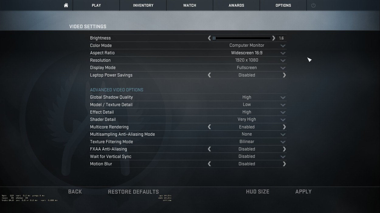 We’ll start with the obvious options. Display Mode should be on Fullscreen for obvious reasons and Laptop Power Savings should be disabled. Brightness is subjective so we won’t go into that. Now we’ll discuss resolution. Lower resolutions result in higher FPS as your computer doesn’t have to render as many pixels as would be the case when you’re playing in the highest resolution (1920x1080). 4:3 resolution stretched gives you a slight advantage as the models are fatter than in your native resolution. Downside to this aspect ratio is the fact that you have two blind spots on both the right and left side of the screen where you can easily miss players pushing or other objects. Test out all the different options and choose the one you feel fits your game style best.