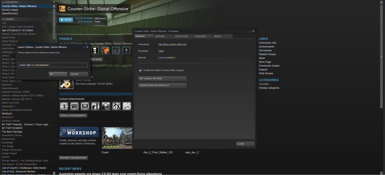 After you installed the game Right-Click on Counter-Strike: Global Offensive, click on Properties and then click on Set Launch Options. In case you haven’t figured it out, this feature will let you configure different facets of the game. There are a couple of lines we’re going to use starting with -novid. This command will cancel the intro video and as such you save some wonderful seconds starting up Counter-Strike. The next command will be -high. This command sets process priority to high and will increase your game performance by a hefty amount. Is your game always taking so long to load into the map? We’re going to change that by adding +cl_forcepreload 1 to the launch options. Maps are preloaded before you even load the map.