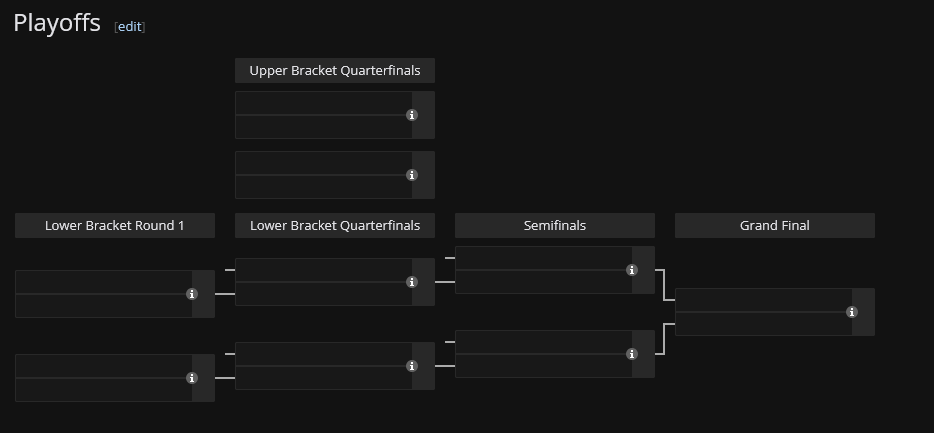 The final stage is the playoffs. We start in the upper-bracket quarterfinals, where the four teams advancing from the winners side of groups face off to determine who reaches the semifinals. The two losing teams drop into the lower-bracket quarterfinals, where they meet the winners from the losers-side matchups.