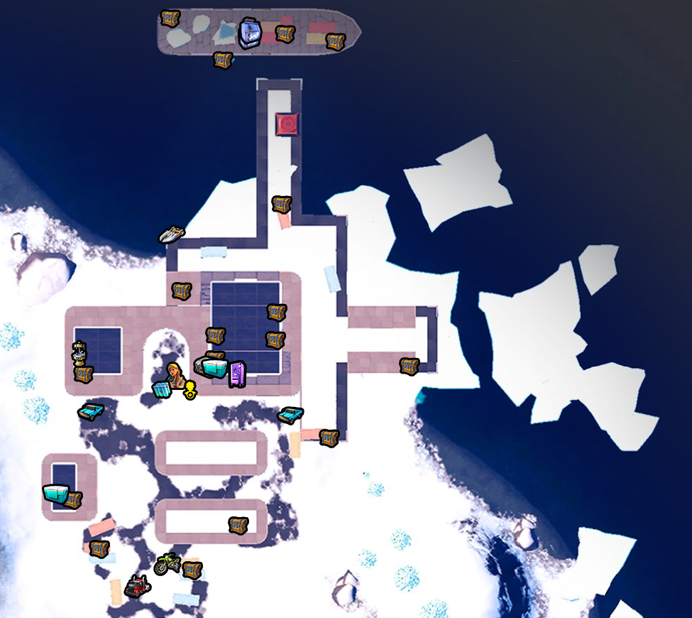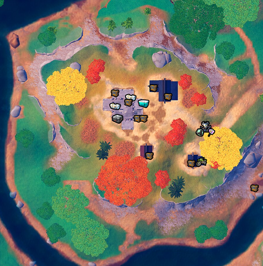 Fittingly named “Exile Isle,” this island directly south of Faulty Splits has the perfect combination of items and weapons needed for a successful solo match. The small castle contains Guardian and Holo chests, which generally contain epic and legendary items to strengthen your loot. Can’t find keys to open the Holo chests? Check your augments for the one titled Keymaster. This augment allows you to receive two keys in your inventory that unlock the items in these special chests. Throughout the rest of this small but mighty island, you’ll find more chests, resources to harvest for materials, and vehicles for movement, such as boats and motorbikes.