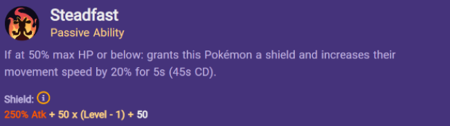 At the top of the page you will find Steadfast (Lucario’s passive ability). The in-game description simply states: “When the Pokémon is at low HP, it is granted a shield and its movement speed is increased”.