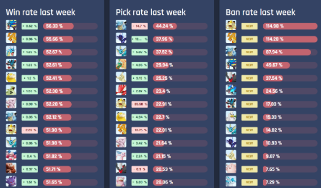This stat is arguably even better at understanding what the ladder believes to be strong. Often you will notice some Pokémon have over a 100% ban-rate this just means that on average it is being banned by both teams in a singular game. What I recommend is if you notice a particular Pokémon with a high ban-rate and you’re limited on currency, avoid purchasing it as it will likely be banned in most games.