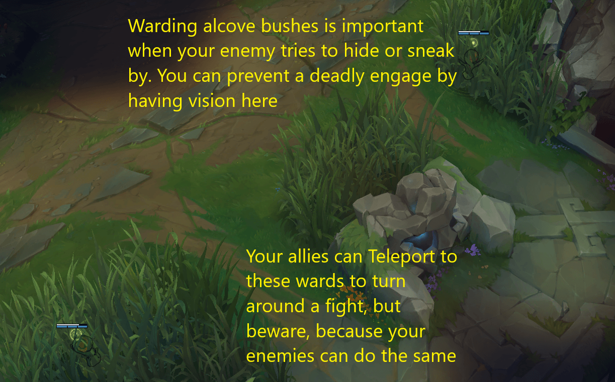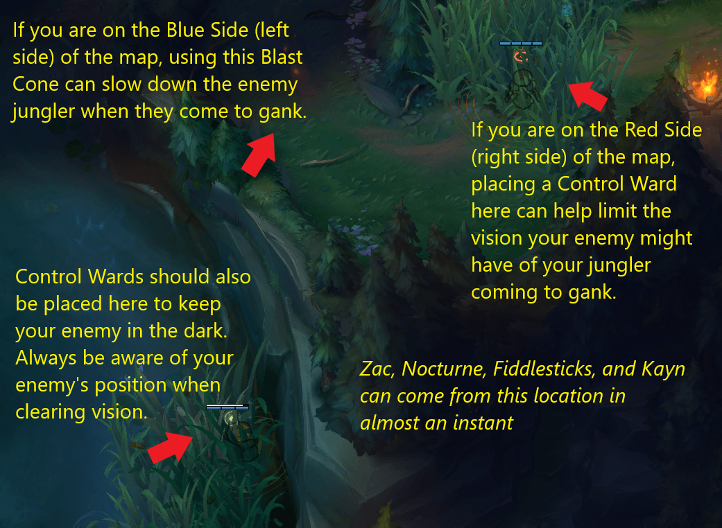 Whether you are winning your lane or not, always ensure that your vision is kept up with, as the enemy jungler can easily punish you for being overextended, or can rotate down and dive you under the turret when you are low. The river and the entrance to the enemy jungle are going to be your main points to keep vision control of at the start of the laning phase. Wards in the river can catch the jungler or the midlaner when they try to rotate down and gank the lane, while wards in the entrances of the enemy's jungle can catch the jungler as they finish camps and make their way down to your lane.
