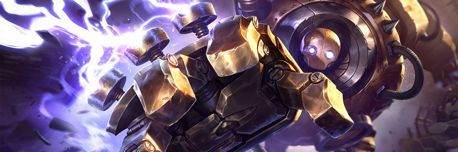 Blitz is a Hook Support that calls Bot Lane his home. His passive is a barrier that is activated when he drops to low health. His Q is his famous skillshot hook that yanks enemies towards his location. His W is a movement and attack speed buff that allows for Blitz to reposition for his hook or escape bad situations. His E is a knock up that deals big attack damage and is often used to follow up his hook or lead into a guaranteed hook if he is within range. His ultimate is an AOE burst that deals magic damage and briefly silences those hit.