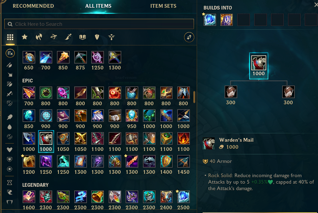 If you’re not going against an auto-attacking champion, Warden’s Mail is worth the extra 200 gold that it costs over a bramble vest. Getting the item’s “Rock Solid” passive in the lane phase can significantly reduce your opponent's damage on you, and it also gives you a couple of solid options for building into a full item later on.