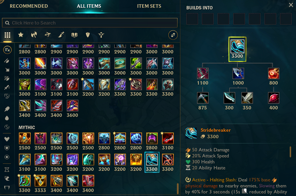 Stridebreaker Stats: 50 Attack Damage, 20% Attack Speed, 300 Health, 20 Ability Haste