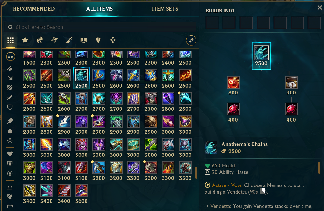 Up first is the health item Anathema’s Chains. There are a lot of things working in this item’s favor. For champions that are looking to only stack health, this item is one of the best, giving a whopping 650, only falling behind Warmogs and actually coming ahead of items like Winter’s Approach, Spirit Visage, and Thornmail.