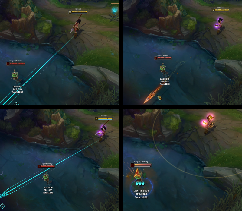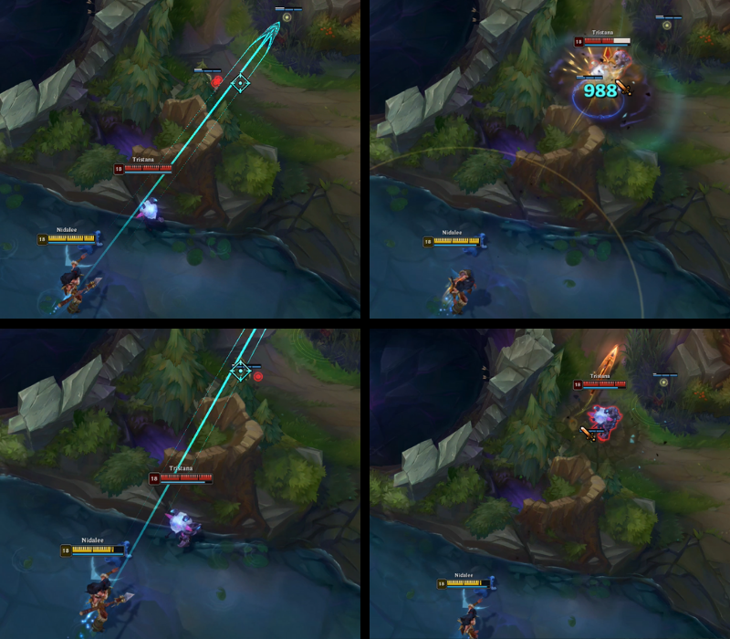 An easy way to remember how to hit from “lower ground” is to aim for the character’s legs. Focus on where the enemy is standing, rather than the top of their character model. While you can hit skillshots aiming high from below, League is much more forgiving if you follow that rule. Look at how far below the target Nidalee is aiming; she still hits!