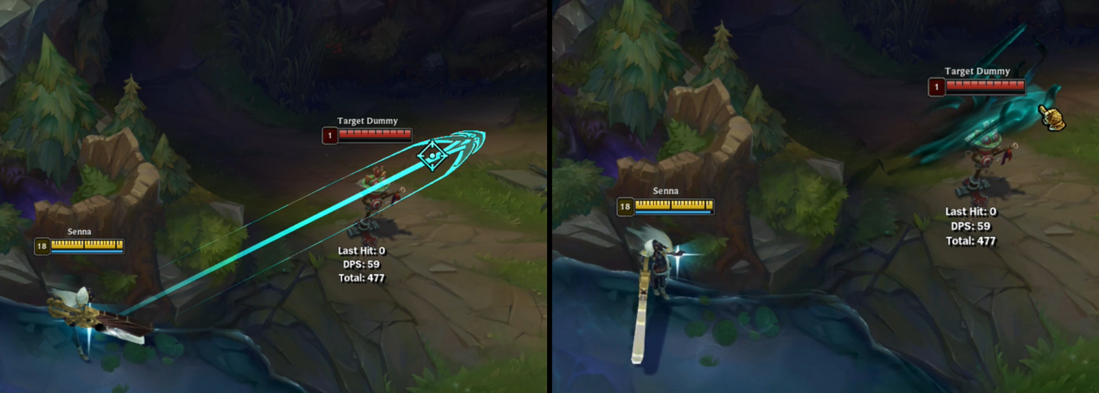 The river appears to be lower ground, so aiming over the center of the character model would normally be the right move, but the hitbox is still grounded on where the enemy Champion is standing. Senna has a pretty generous hitbox on her W, but looking at a narrower ability makes this much clearer.