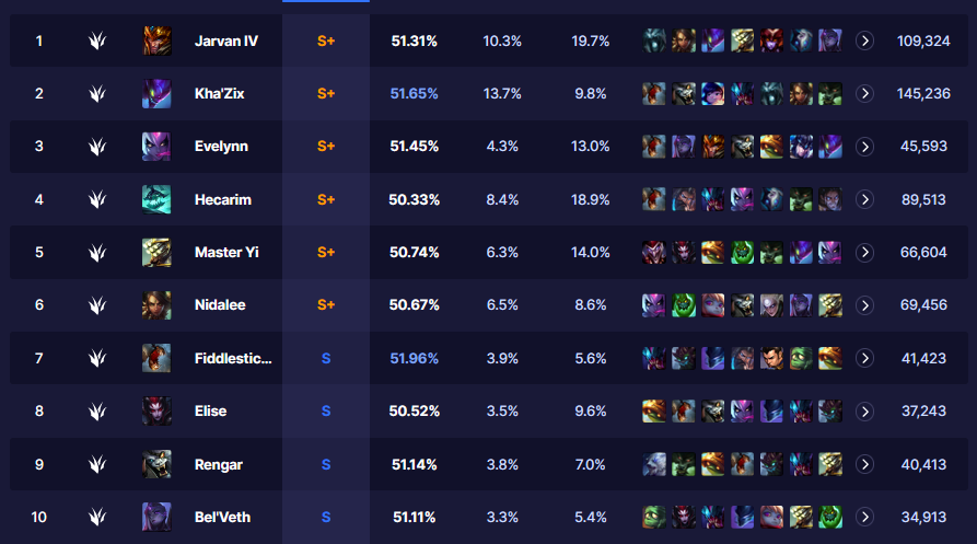 As far as Champion designs go, there’s been a solid balance between Ganking and Farming Junglers across each patch, at least when looking at solo queue. But the edge between the two modes of Junglers is seemingly given to the more aggressive Gank-focused Junglers. Champions like Jarvan, Elise, Hecarim, and Nidalee have remained consistent picks in the Solo-Queue space due to their ability to take over games quickly by themselves and use their fed states to facilitate aggressive control and plays around the map.