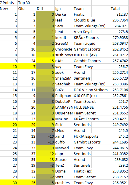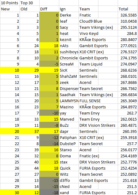 The number of Duelists/Pseudo-Duelist dropped slightly, going to 24 of the Top 30 being Duelist/Pseudo-Duelists. However, several low ACS rated players, like Former Fnatic Domagoj "Doma" Fancev or Sentinels Michael "dapr" Gulino jumped in usage. Acend’s Patryk "starxo" Kopczyński in particular made a massive jump, starting from 39th and landing in the (28th/26th/23rd) spot, depending on the utility weight. Others tanked hard, like Former FURIA Esports Alexandre "xand" Zizi, starting 12th in regular ACS then landing in (19th/22nd/30th) place.