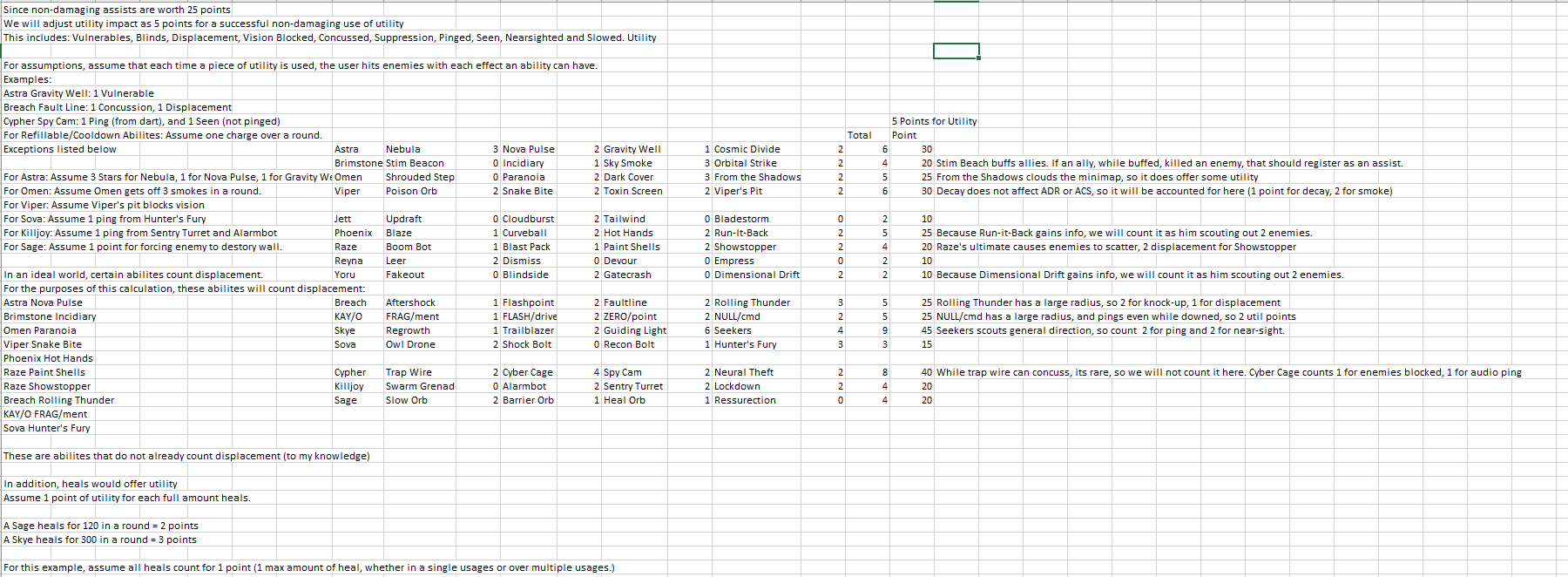 From there, I assigned value to these utility points. This is where the thought experiment went into play. I tested three point levels: 5 points for a successful piece of utility, then 7 (was going to do 7.5, but since all other points are rounded, I rounded it to 7), then 10 points. Every single level I tried was still lower than the 25 points given for non-damaging assists. The results I got were then applied to the ACS they were already given.