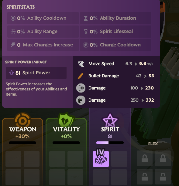 The best way to get Spirit Power is by purchasing Spirit items in the purple section of the shop. If you’re looking for raw spirit power, look no further than the aptly titled “Extra Spirit” and its upgrades “Improved Spirit” and “Boundless Spirit.” Those items provide 10/30/65 Spirit Power, respectively, with an additional 4/8/16 bonus, depending on their tier in the item shop. While the amount alone makes these items strong, this doesn’t even consider the additional buffs they provide. Other than Spirit items, certain Weapon and Vitality items also provide Spirit Power, don’t be afraid to check out the effects of the items you’re buying. One of the standout non-Spirit items that provide buffs is the weapon item aptly named “Spiritual Overflow,” which, when built up by shooting an enemy, provides a whopping +50 Spirit Power.