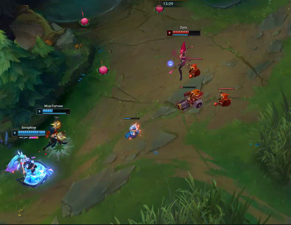 In the example above, Seraphine and Miss Fortune engage in combat with the enemy Zyra and Seraphine shields her ADC, triggering their Moonstone Renewer and allowing her healing shield power to increase as well.