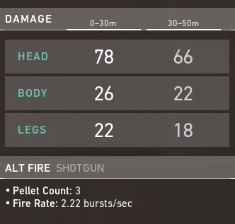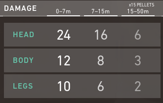 As the least expensive buyable weapon in the game, spending 150 credits allows for flexibility when choosing to buy light armor and/or abilities, just like the Classic. Considering the maximum damage output is within a small range of 0-7 meters, it would be best to play at a spot where you would want the enemies to approach at a close range, such as a close corner. Each of the 15 pellets deals 24 damage to the head, 12 damage to the body, and 10 to the legs. Let’s say for example you were to hit all 15 pellets to the head on an enemy, it would leave the enemy beyond guaranteed death regardless of full or half armor.